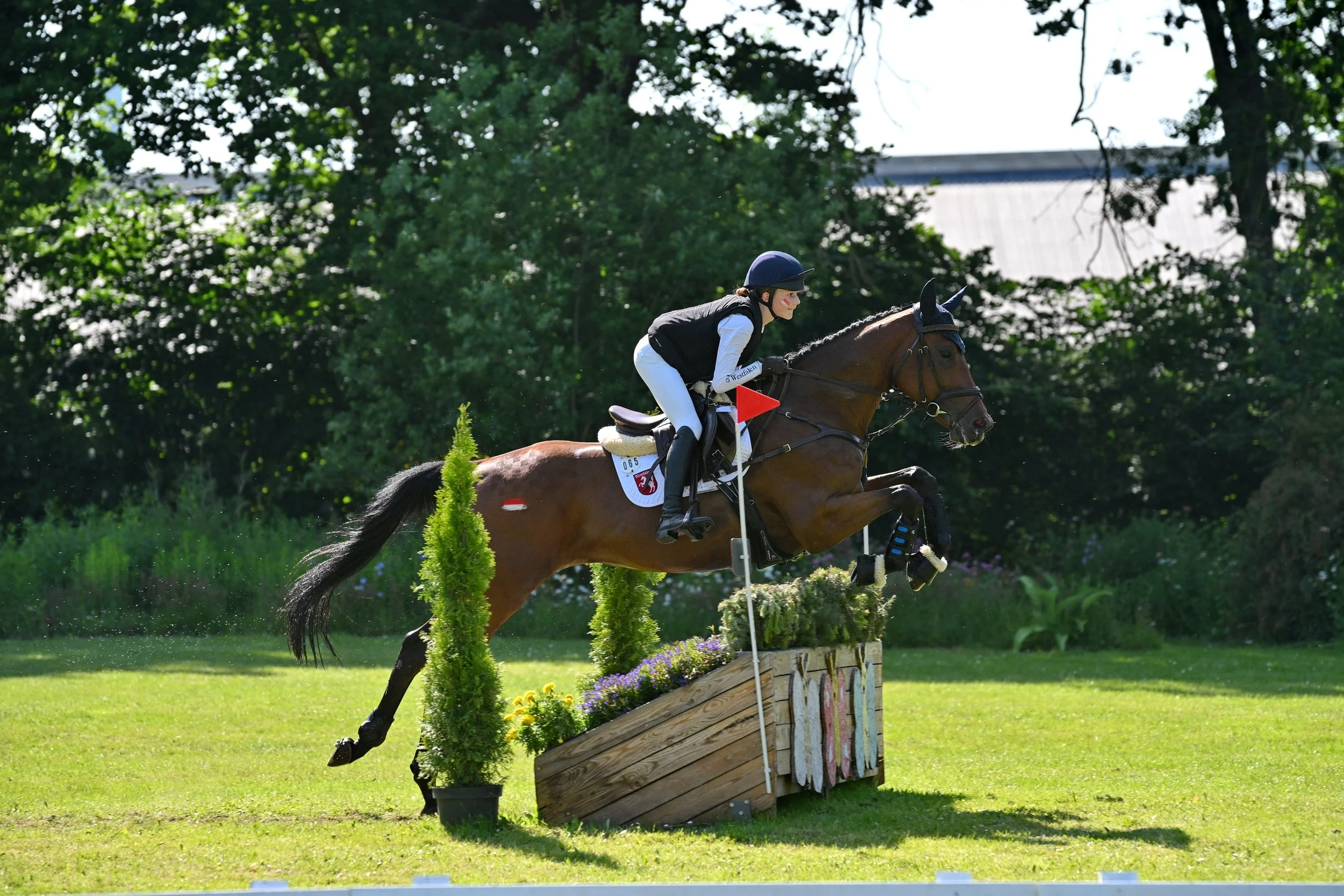 Was dann folgte, ist eigentlich ein kleines Märchen: eine der jüngsten Reiterinnen dieser Tour, Frieda Schulze Zurmussen, absolvierte in einer absoluten Gelassenheit mit hervorragenden Noten die Dressur und auch den theoretischen Teil. Das Gelände stand an. Mit großer Konzentration und Selbstverständlichkeit ritten Frieda und Idea sehr rhythmisch und gleichmäßig durch das Gelände, mit einer Endnote von 8,9. Allerdings: das Tempo war zu gering, sodass am Ende 0,5 Punkte abgezogen werden mussten. Damit war klar, dass es sicherlich für eine Platzierung reichen würde. Die morgendliche Musterung des Pferdes vor den Richtern an der Hand ergab eine glatte 10,0. Die Spannung stieg wieder. Als vorletzte ritt Frieda durch den Spring-Parcours und zeigte hier, was Harmonie zwischen Reiter und Pferd bedeutet.